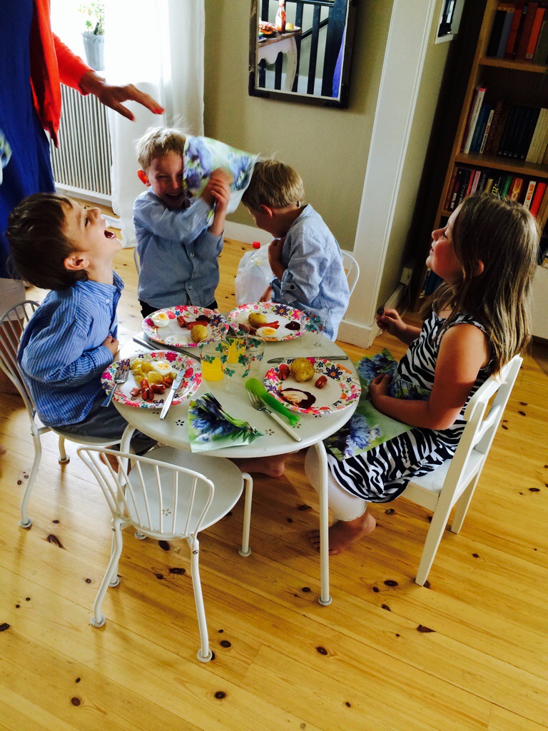 Och plötsligt finner jag mig själv i den där hemska rollen. Skäller på 4-åringen för att han råkat spilla ut saft när han entusiastiskt och viftande berättar hur man skulle kunna leka en lek medan man häller upp saft. Den törstiga mamman är helt ointresserad av lek då, utan vill bara hälla upp saft, dricka själv och få barnen att dricka. Han blev arg och ledsen och tog med sig det nya saftglaset in på sitt rum. Där han spillde ut även det, i sängen. ”Jag skojar inte nu mamma, men jag har spillt igen.” sa han när han kom för att be om hjälp. Stackars barn. (Här lyckades jag sansa mig.)