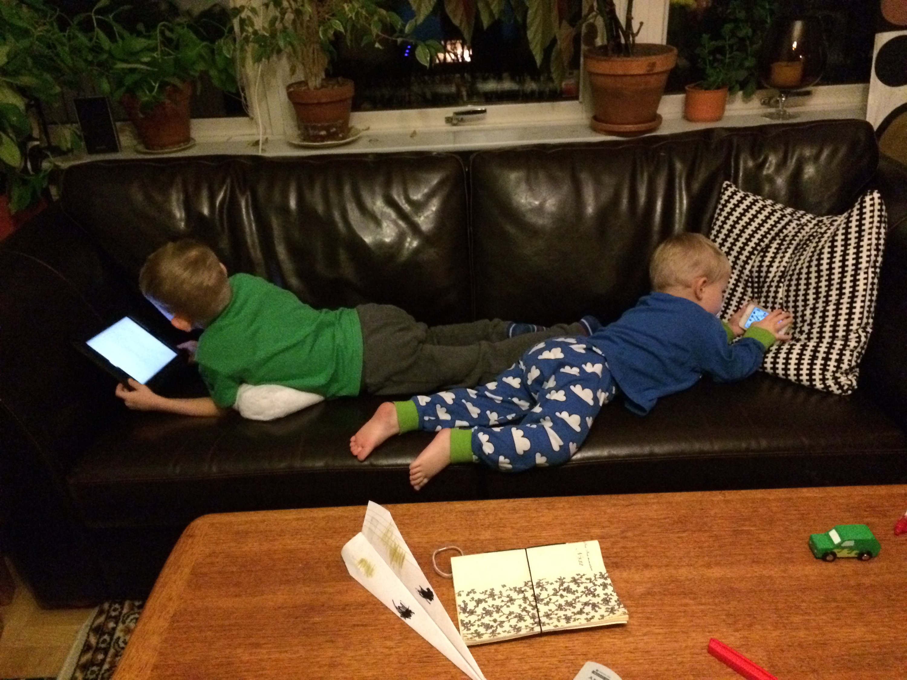 I övrigt har vi haft en bergodalbanadag a la 2,5-åring idag. Storebror har kämpat och varit snäll. Lät lillebror låna sin bästa tröja imorse, lånade ut plats på sin stol till frukosten, lät honom ta av hans mat, lät honom låna det nya flygplanet och kramades och pratade snällt. Det fungerade ganska länge, säkert en timme. Sen började smockorna, knuffarna och leksakskasten. Det varvades med lek, bus, skratt och kramar. Och ilskeutbrott utan dess like.